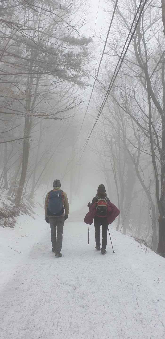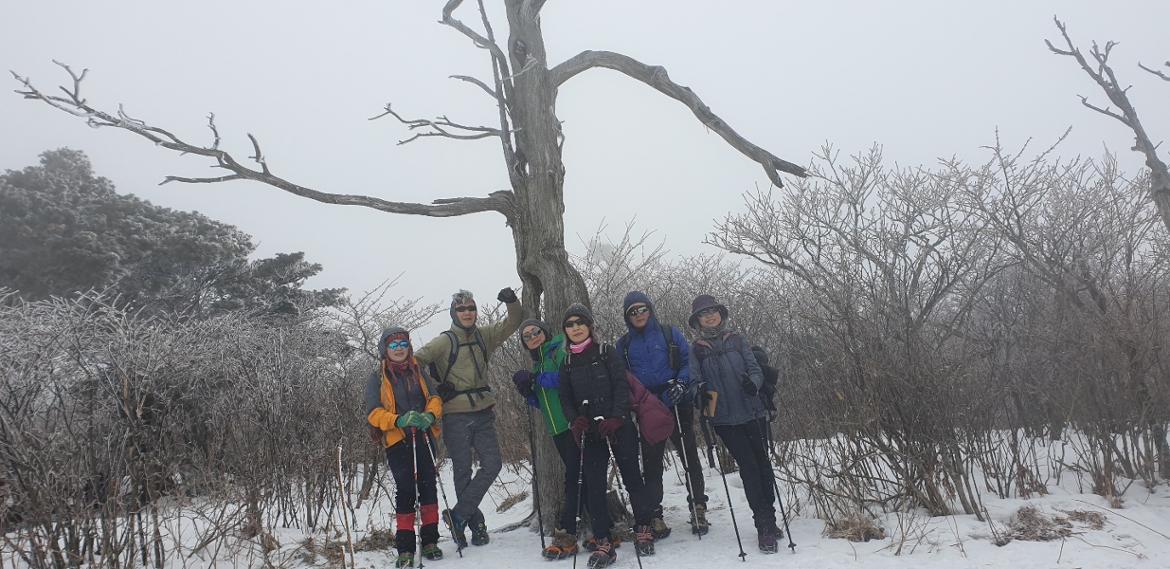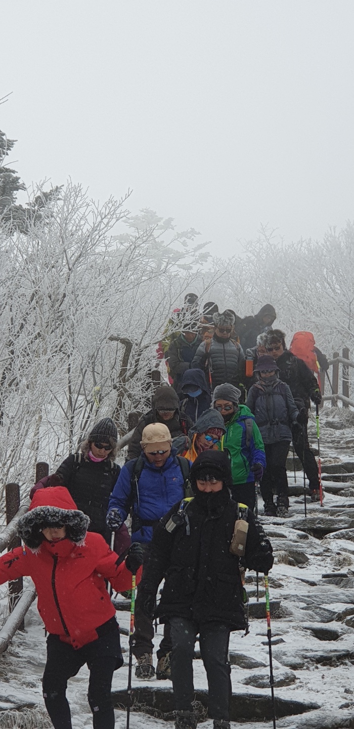 실눈이 오는건지 안개에 휩쌓인듯한 숲과 나무들,절경에 손가락이 시러웠지만 인생샷을 남기기위해 카메라 셔터를 고군분투하며 누르던 일,아낌없이 주는 나무처럼 손 시러움 참아가며 사진 찍어 주시고 하산길 급경사에 무릎 안좋아 뒤쳐지는 50+여성 동지들 끝까지 챙겨주신 회장님 감사하고 감동이었습니다.