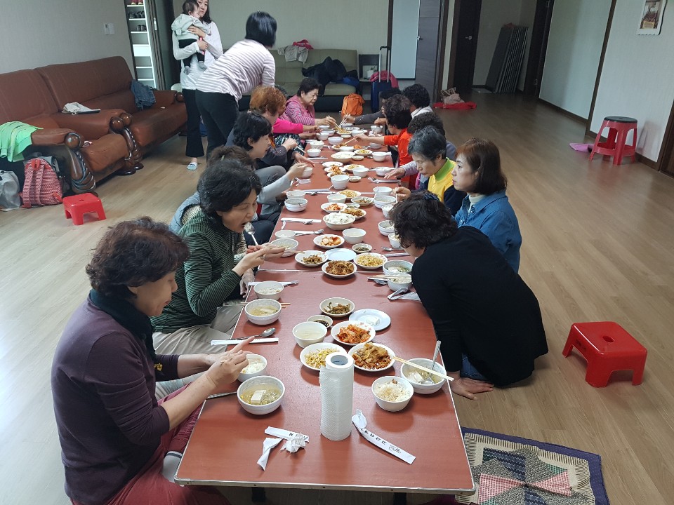 도시 활동보다는 힐링도 겸해서 가까운 농촌으로 가자는 의견에 따라 회원 중 한 분의 친구가 전원주택을 짓고 살고 있는 매화2리의 마을회관으로 정해 콜라보를 했습니다. 마을회관의 어르신들과 부녀회 회원을 포함해서 15명이 참여를 했습니다.