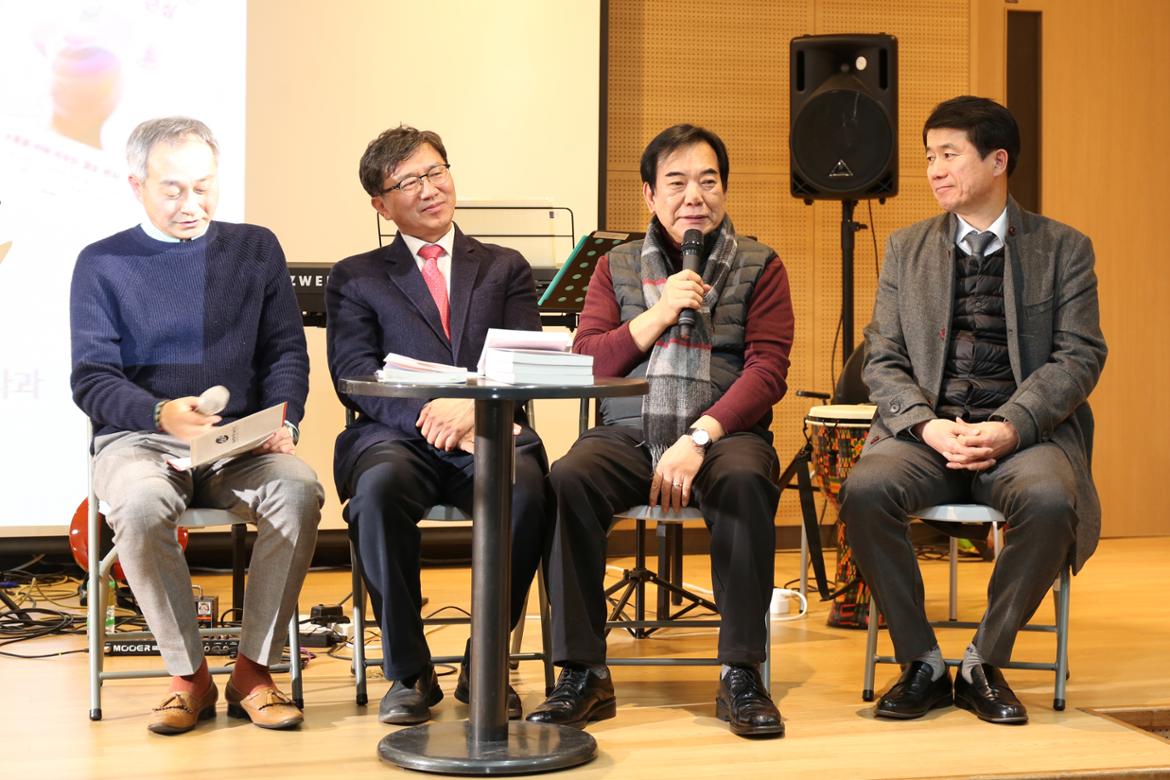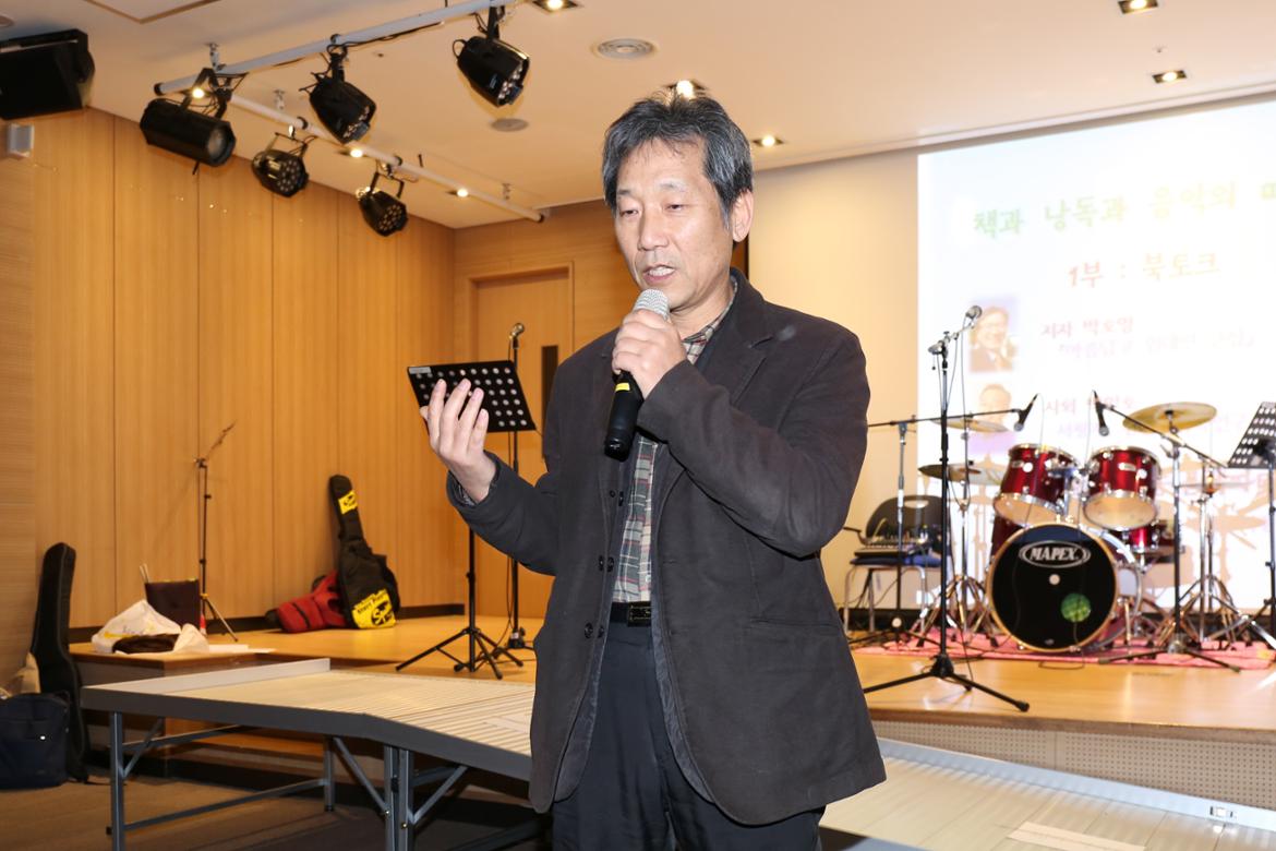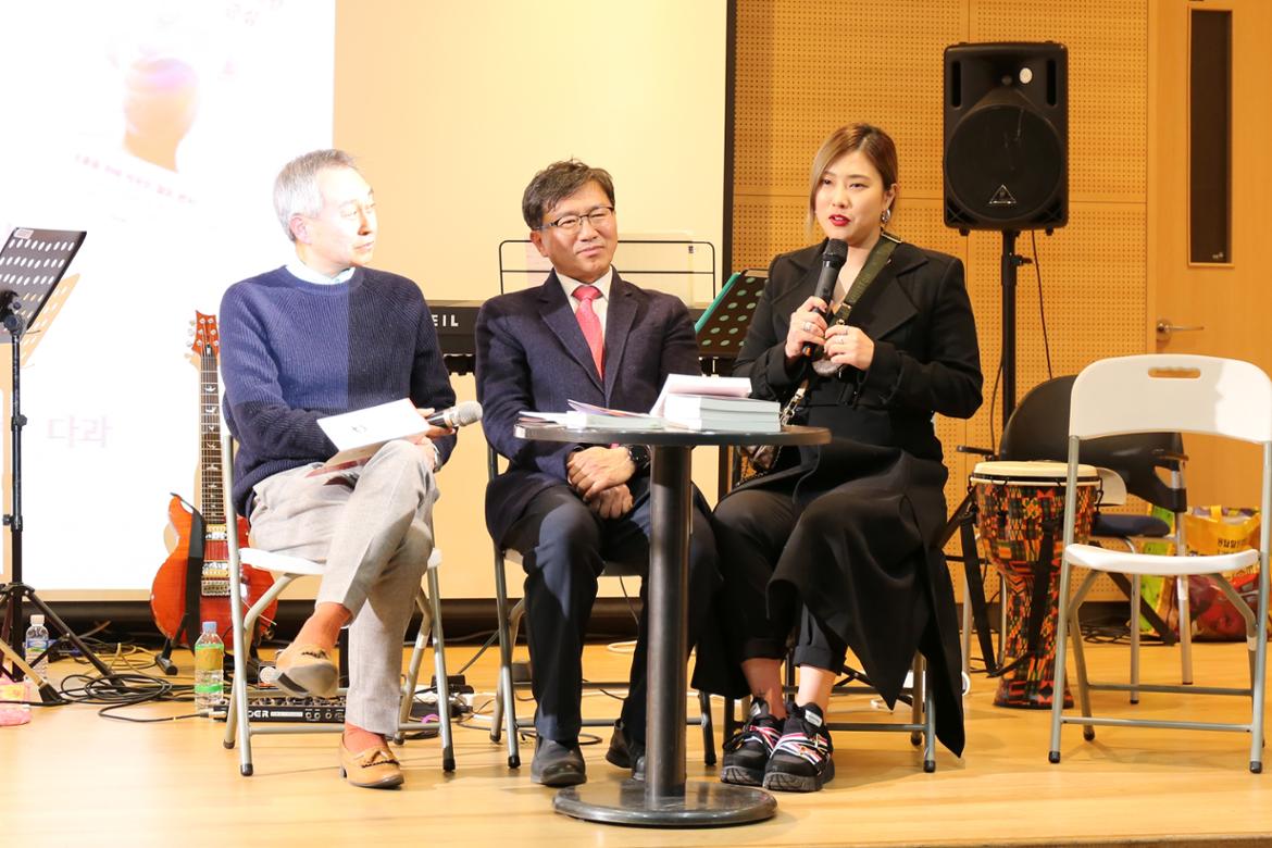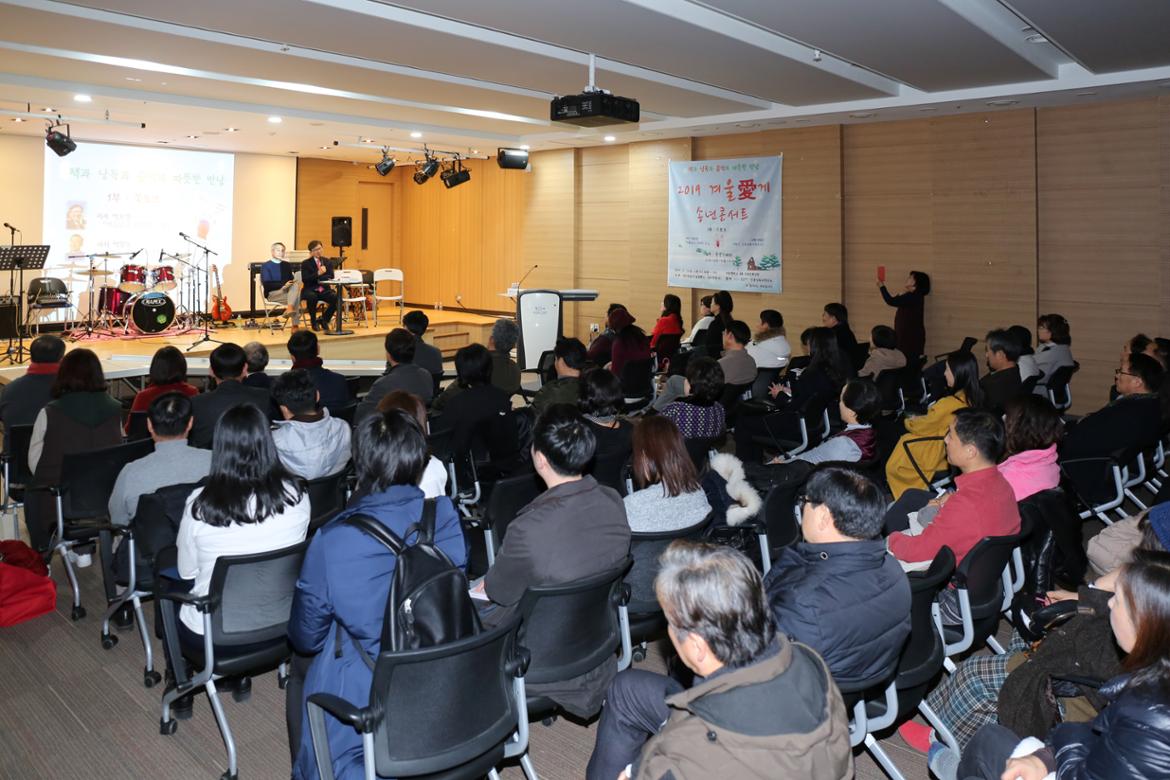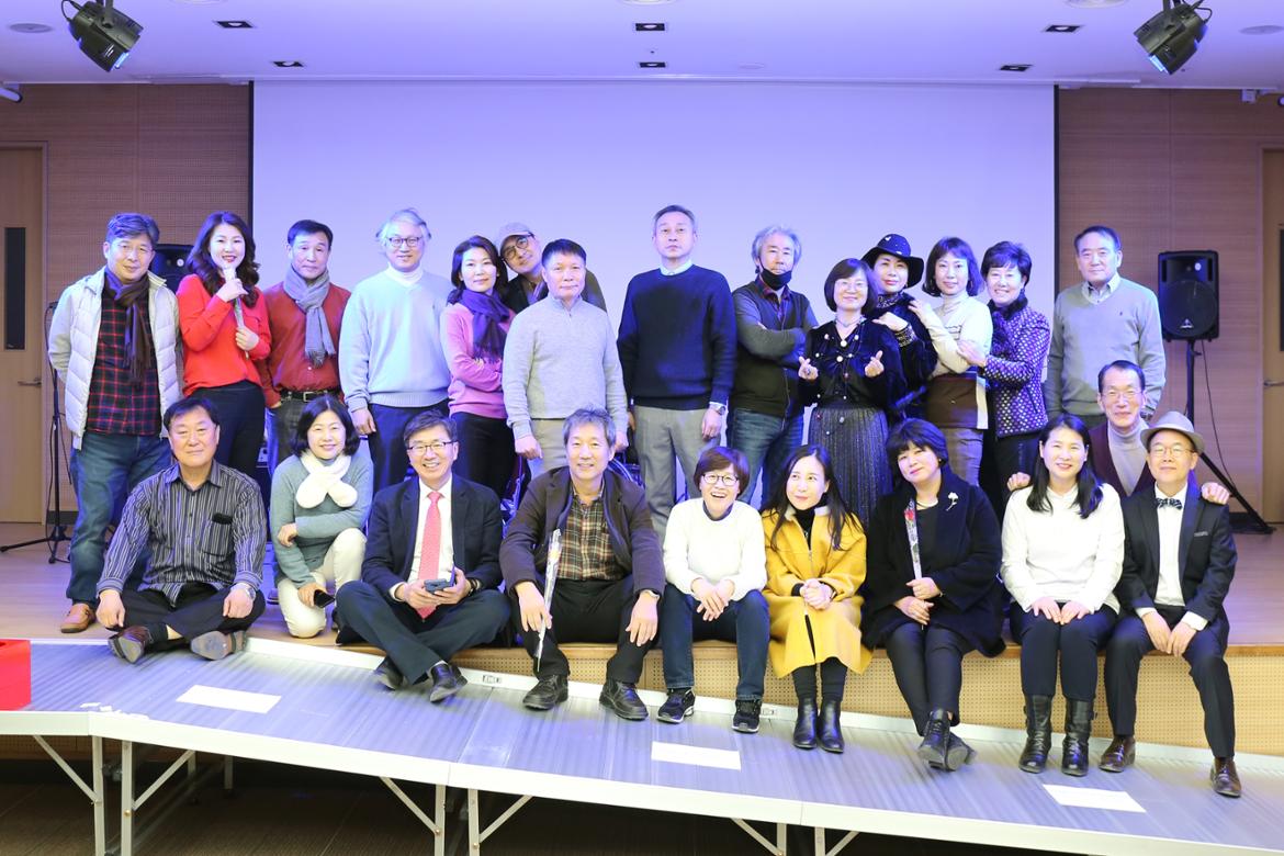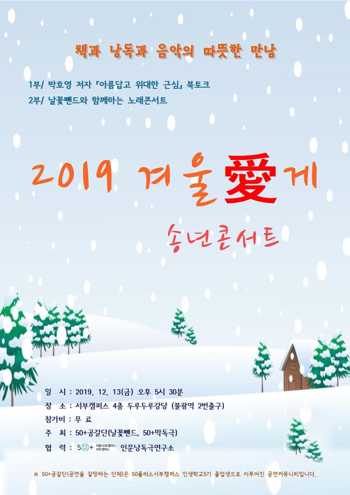 2019년 12월 13일의 금요일, 50+공갈단(‘공연을 갈망하는 단체’라는 뜻으로, 50플러스 서부캠퍼스 인생학교5기 졸업생이 만든 다양한 커뮤니티 중에서 공연을 목적으로 하는 ‘날꽃뺀드’와 ‘50+막독극’이 함께 만든 단체입니다)이 만든 <2019 겨울愛게 송년콘서트>가 열렸습니다. 북토크+노래+낭독이 어우러진 따뜻한 만남의 시간으로 90분 동안 관객과 함께한 흥겨운 자리였습니다.