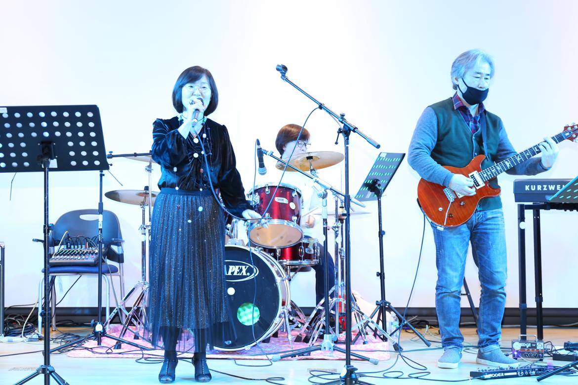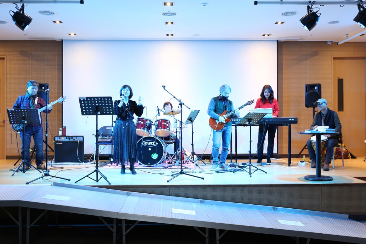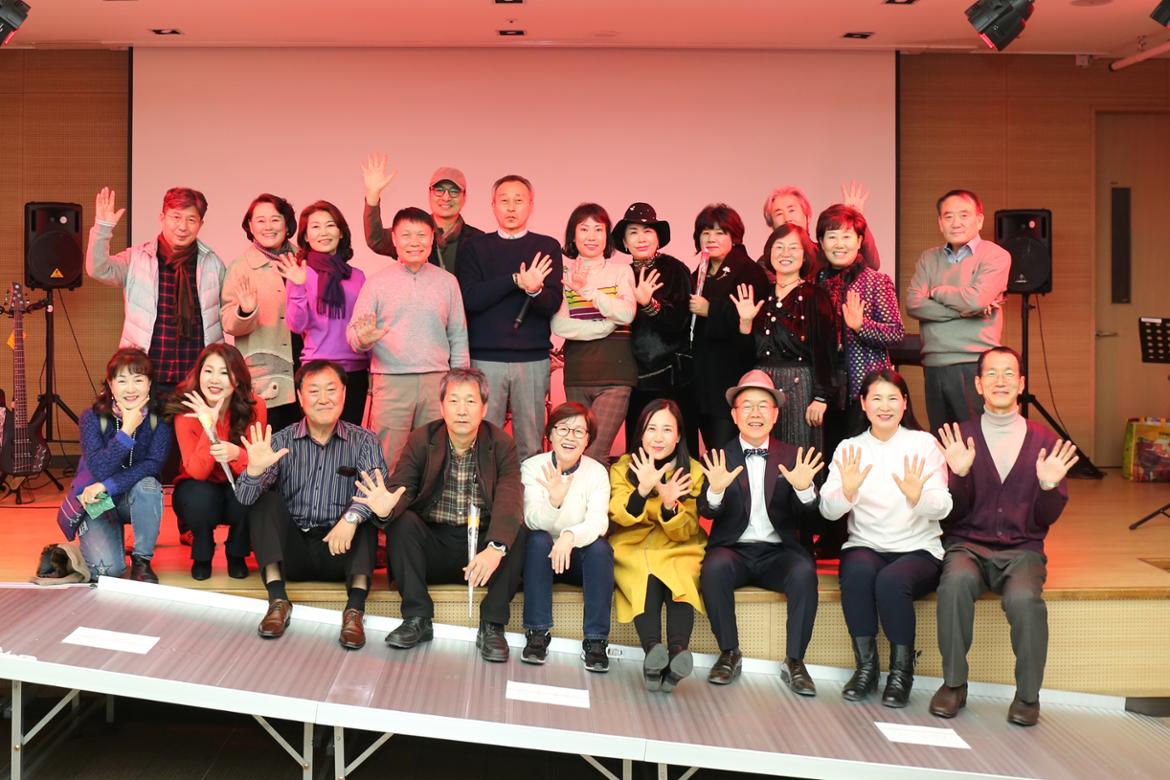 손준호님의 독창으로 막을 올린 송년콘서트는 박원순 서울시장의 축하영상, 정광필 인생학교 학장의 축사에 이어 『아름답고 위대한 근심』의 저자인 박호영님과의 북토크가 30분간 이어졌습니다. 박호영 저자의 따님인 뷰티크리에이터 씬님과 유머일번지에 나왔던 개그맨 정명재님도 함께 자리하여 더욱더 다양하고 재미난 북토크가 되었습니다. 북토크 중에는 책의 내용과 아름다운 시로 50+막독극 커뮤니티의 낭독이 더해졌습니다. 이어진 날꽃뺀드의 공연 콘셉트는 레트로 분위기 물씬 나는 트로트! 유영남님과 권옥순님의 보컬이 빛을 발휘한 신나는 무대였습니다. 50+공갈단 공식 사회자 박일호님의 대담과 진행은 역시 기대를 저버리지 않는 매끄러움과 노련함을 보여주었습니다.