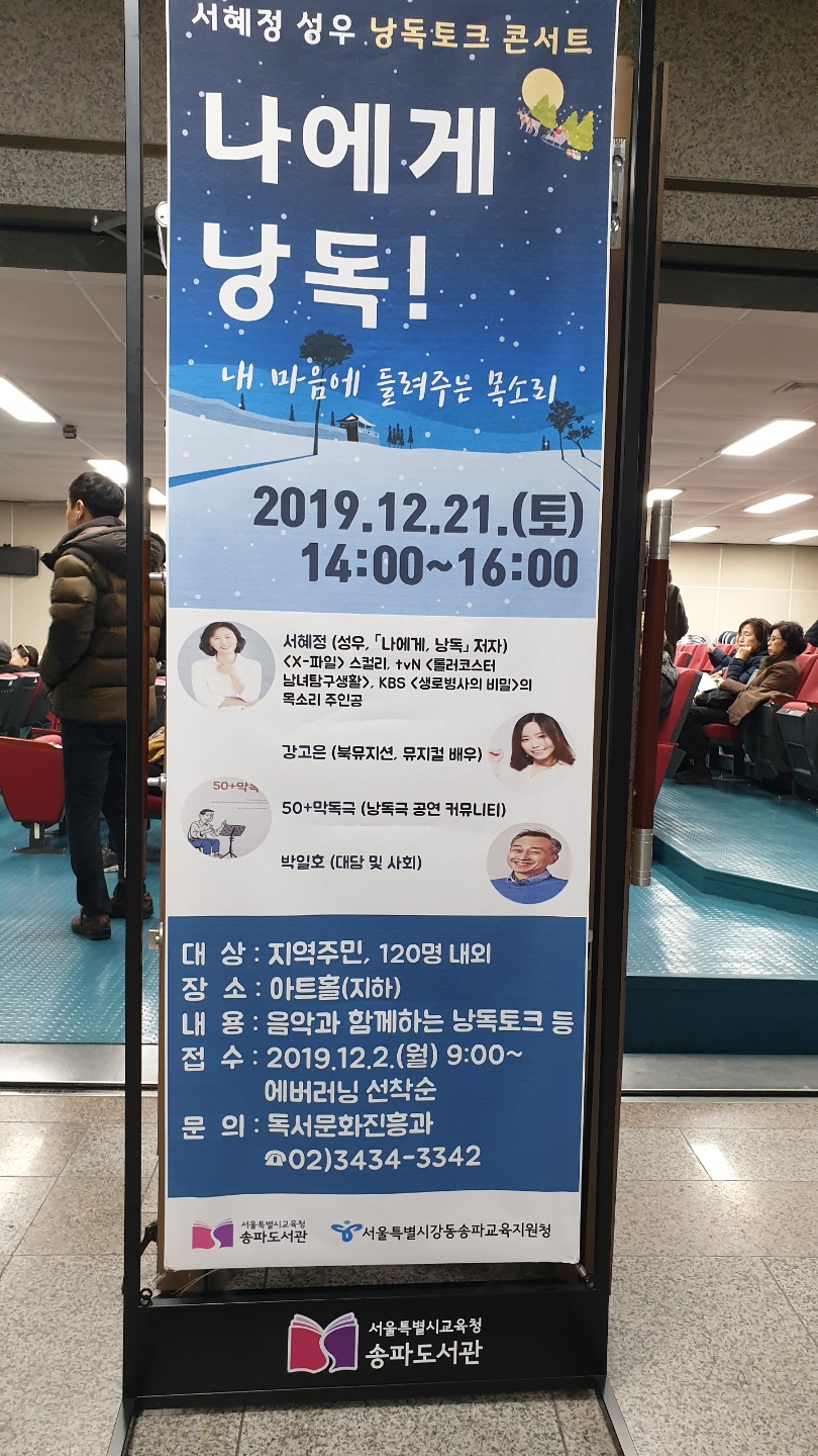 2019년 12월21일 송파도서관에서 낭독토크콘서트에 출연하여 낭독극 <눈>을 공연했습니다.