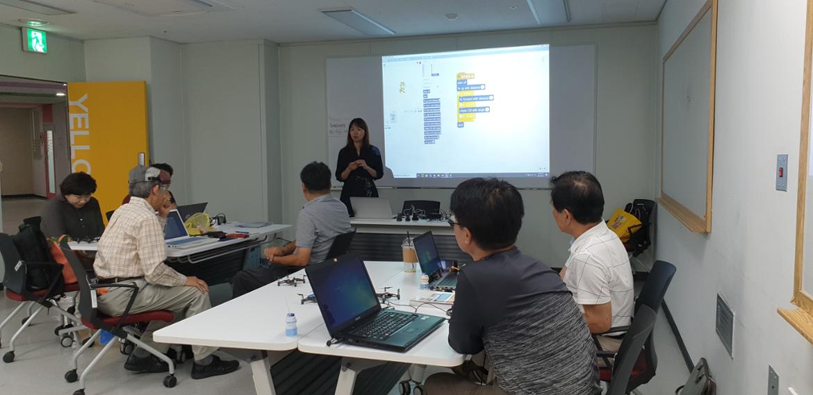 강사님의 미션에 따라 지참한 노트북에 직접 코딩해보고 코딩한 알고리즘에 따라 드론이 비행하는 가를 지켜보는 순서로 이어졌습니다.