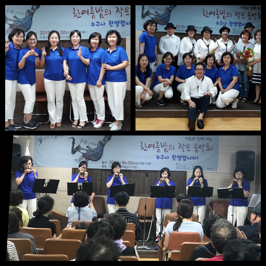 -서울사랑오카리나가 용산구소재 이촌2동새마을금고 강당에서 우리동네 작은 음악회에 참석하여 동네주민과 함게 흥겹고 즐거운 힐린의 시간봉사하였음 연주곡 : 아름다운 베르네, 최진사땍세째딸, 아빠의청춘, 홀로아리랑 앵콜곡 : 야래향 |