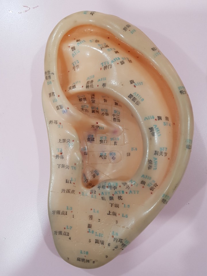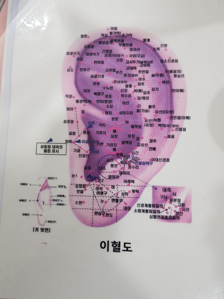 2. 이침은 귀모형과 인쇄물을 프린트하여 그것을보면서 1차로 교육을하여 전회원이 숙지를하였으며, 각파트너의 귀의 형태 및 색깔 , 아픈정도 등으로 신체의 이상증상을 예측할수있는바