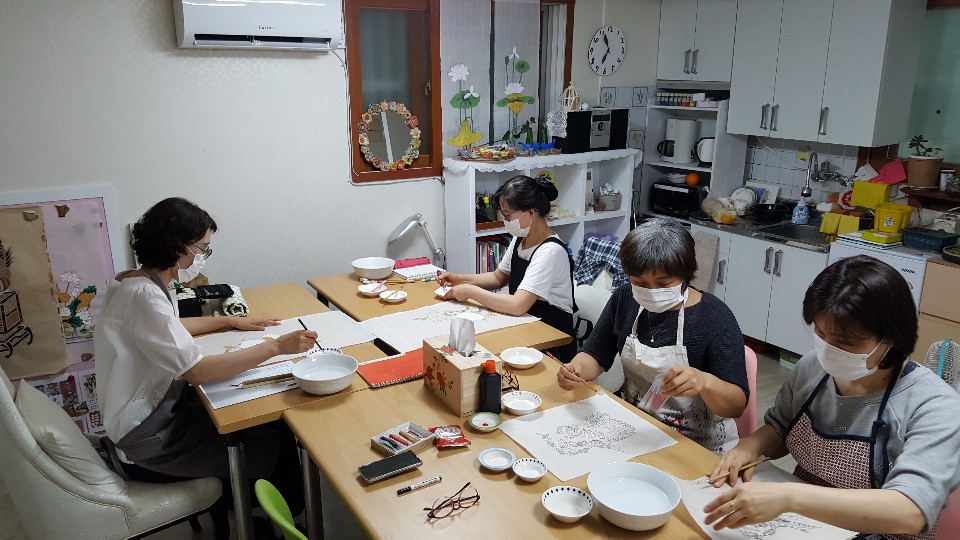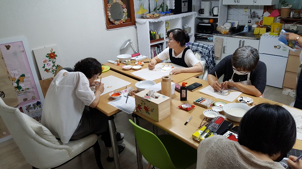 까치호랑이의 기본색인 먹색으로 선을 칠하며 민화의 기본채색을 익혔습니다. 모란도의 바위, 꽃잎을 칠하며 바림을 익혔습니다. 바림은 그라데이션(gradation)을 의미하며 민화의 색감을 풍부하게 하며 자연스러운 느낌을 표현하는데 중요한 요소 입니다.