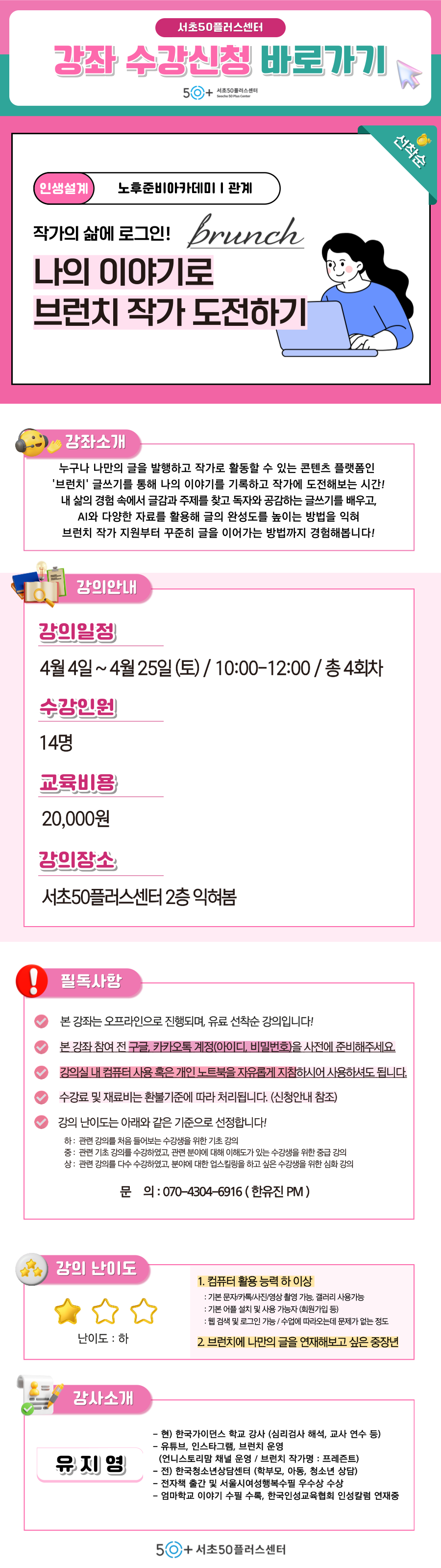 익혀봄 유지영 [ 나도 브런치 작가가 될 수 있을까? ] 브런치를 해야 하는 이유 기록 - "내 삶을 관찰하다“ 나의 인생 그래프를 간단히 키워드로 그려보기. 내 인생에서 글감 찾기, 일상에서 찾기 쉬운 주제로 짧은 글을 써보기 개인 노트북 (자유 지참), 필기도구