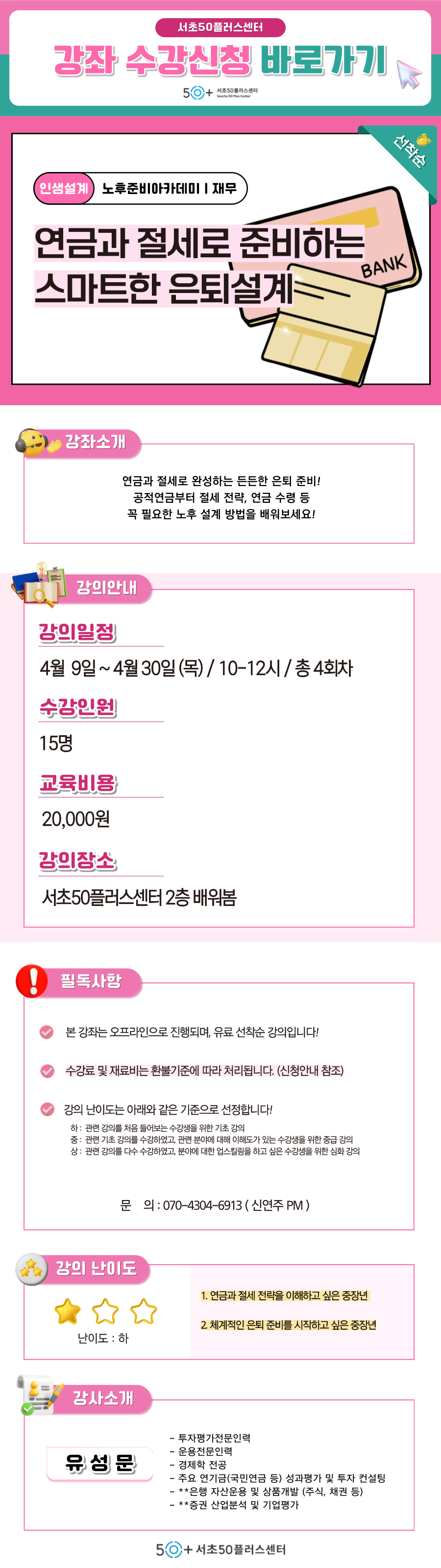 [서초][재무] 연금과 절세로 준비하는 스마트한 은퇴설계마감 D-19