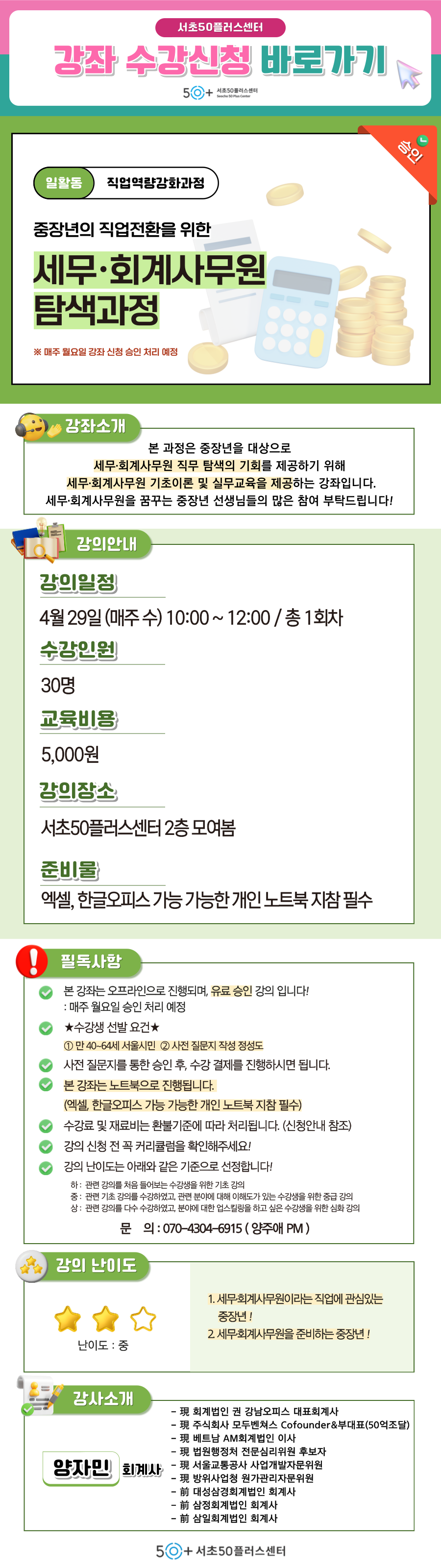 [서초][직업역량강화교육] 중장년의 직업전환을 위한 '세무·회계사무원 탐색과정'마감 D-38