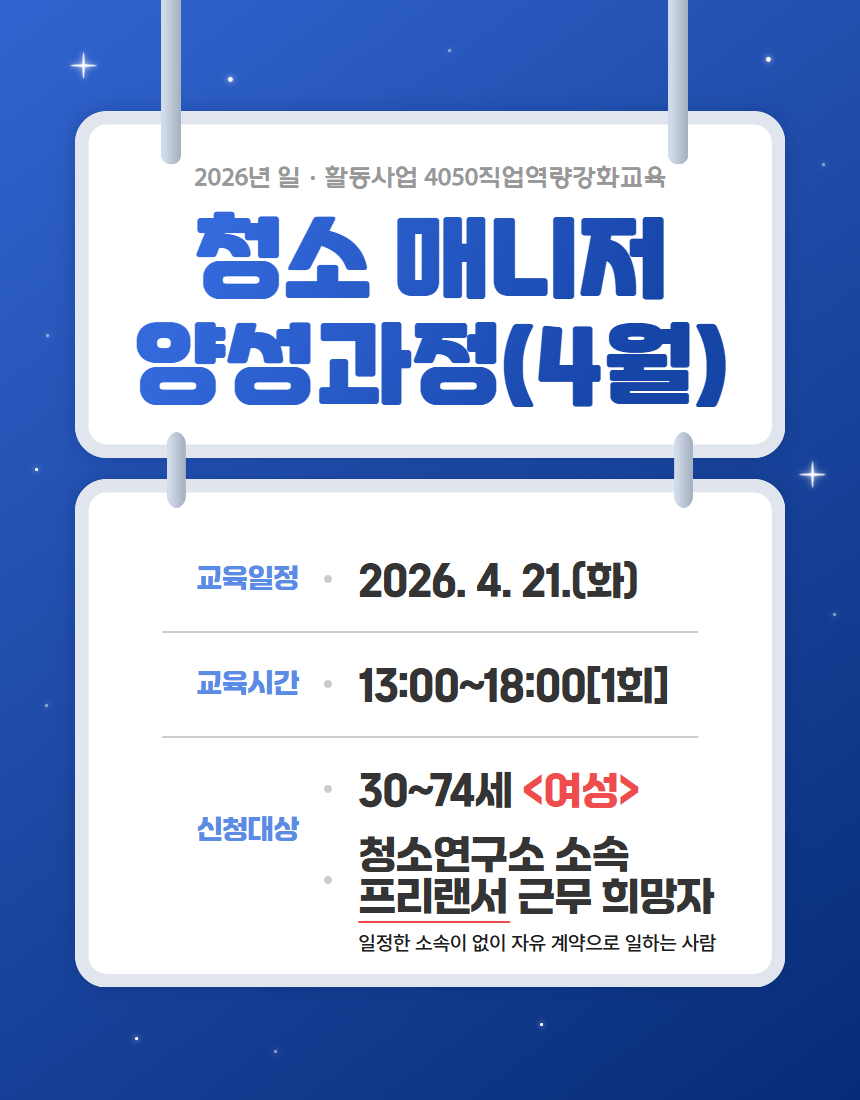 [금천][4050직업역량강화교육] 청소연구소와 함께하는 청소매니저 양성과정(4월)마감 D-13