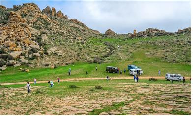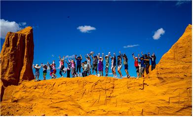 비얀자크는 돌이 되지 못한 퇴적층 지대인데 붉은색이 매혹적이다. 돌이 되지 못한 이유는 나이가 젊은 신생대 지층이기 때문이다. 빠른 속도로 침식되기 때문에 매년 풍광이 달라진다고 한다. 1922년 공룡 화석이 발견되었다. 초원에서 실패한 단체 점프 씬을 이곳에서 다시 찍었다. 사진사가 절벽 아래 있으니 모두 성공한 것처럼 보인다.