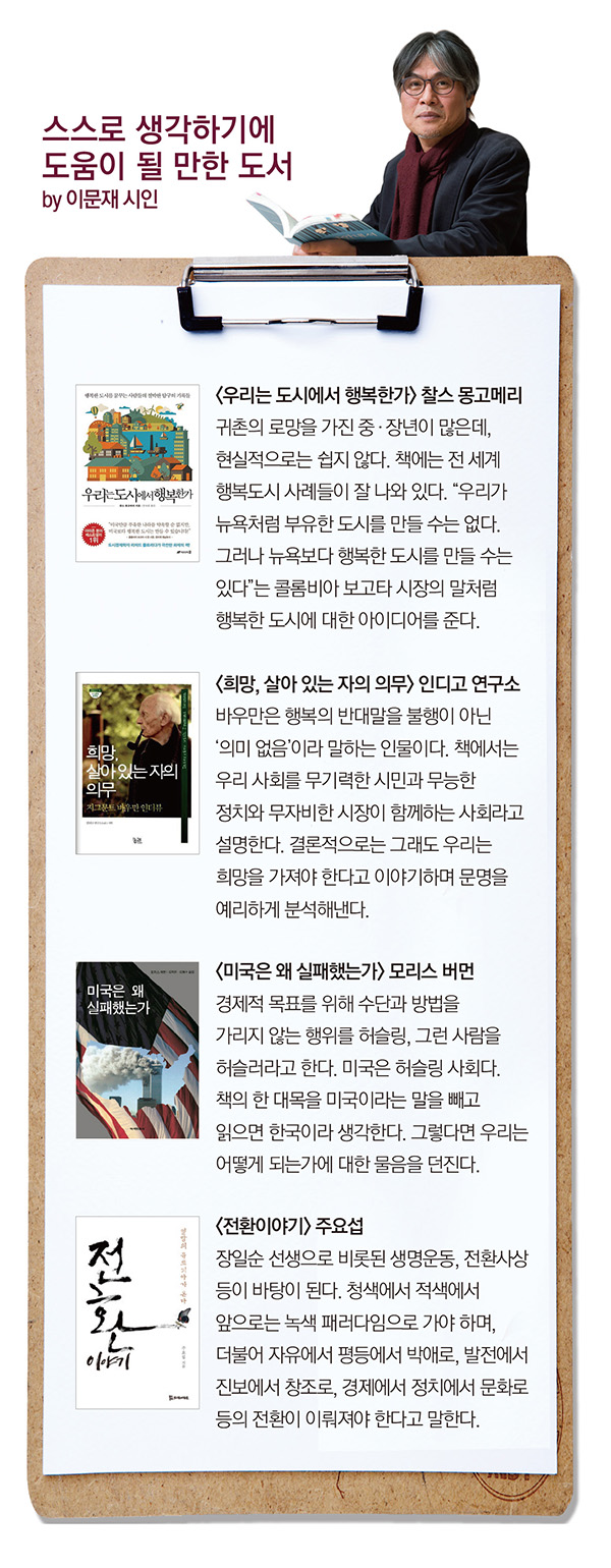 이문재(李文宰·57) 시인 겸 경희대 후마니타스칼리지 교수는 2014년 <지금 여기가 맨 앞>을 펴내며 이런 말을 썼다. ‘시란 무엇인가라고 묻는 대신 시란 무엇이어야 하는가라고 물었다. 시가 무엇을 할 수 있는가라고 묻지 않고 시가 무엇을 더 할 수 있는가라고 묻곤 했다. 시를 나 혹은 너라고 바꿔보기도 했다. 나는 무엇이어야 하는가. 우리는 무엇을 더 할 수 있는가. 그러다 보니 지금 여기 내가 맨 앞이었다.’ 지금 여기 맨 앞에 선 그는 <저항안내서(하랄트 벨처 지음)>를 통해 실천하는 지성의 중요성을 이야기한다.