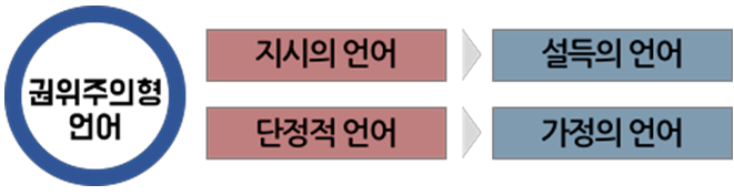 셋째,권위주의형 언어이다.자신의 직급이나 지위로 후배들에게 권위적으로 대하는 언어이다.지시의 언어가 대표적이다."시키는 대로 해" "말대꾸하지 말고…" 요즘 젊은 세대는 상명하복의 수직적권위로 강요하는언어를불편해 한다. "그래,네 생각도 괜찮은데." 그들의 이끌고 마음을 열기 위해서는 명분과 실리를 통해 참여를 이끄는‘설득의 언어’가 효과적이다.권위주의형 언어의 또 하나는 단정적 언어이다."그건 아니지…” 처럼자기 확신에 찬단정적인 언어는젊은 세대에게 부정적인 인상을 준다.젊은 세대와 소통할 때는 “나도 틀릴 수도있지”라는 전제로 상대의 의견을 묻는‘가정의 언어’를 사용하는 것이 효과적이다.