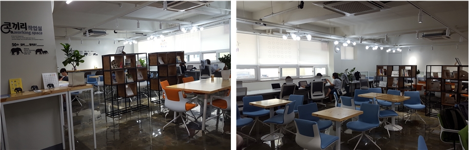 복도로 들어서면 오른편에 제2의 인생설계를 준비하는 데 필요한 코워킹스페이스 ‘큰 코끼리 작업실’이 마련되어 있다. 코끼리 작업실은 사회성이 높은 동물로 알려진 코끼리처럼 50+ 세대가 인생의 먼 길을 서로 도우며 함께 하자는 의미를 담은 이름이다. 이곳은 지정석과 자유석으로 나뉘어져 있으며, 지정석은 공모를 통하여 이용할 수 있고 자유석은 자유롭게 이용하면 된다.