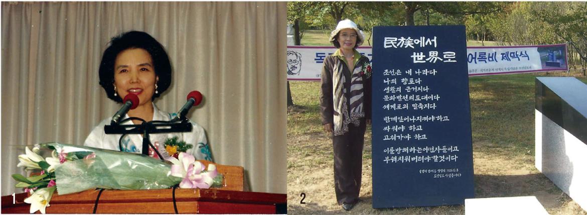 ▲1993년4월 부활절에 즈음해서 한국기독교문학상 시상식에서 수상소감을 말하는 안혜초 시인(왼쪽). 2009년10