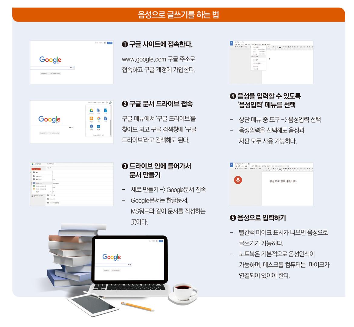 어디에 쓸지를 알아봤다면 어떻게 쓰는지를 알아볼 차례다. 컴퓨터를 켜고 키보드에 손을 올리고 글을 쓰려고 하면 머리가 하얗게 된다고 말을 하는 사람들이 있다. 그리고 “키보드 자판에 익숙하지 않아서 타자가 느려요” 하는 사람들이 있는데 이럴 때는 자판으로 치는 것보다 음성으로 입력하는 것이 더 도움 된다. 말로 술술 풀어 놓고 나중에 편집만 하면 좀 더 쉽게 글쓰기가 된다. 음성을 글로 바꿔주는 서비스들이 있는데 그중에서 가장 편한 도구가 구글이 만든 ‘구글드라이브’이다. ‘구글드라이브’는 한글, 엑셀, 파워포인트를 만들어주는 곳인데 이곳에서 문서를 작성할 수 있다. 빈 문서를 열고 ‘음성입력’을 누르면 내 말소리가 글로 변한다. 간혹 오타가 있지만 나중에 수정하면 된다. 말로 글을 쓰면 생각이 술술 풀리기도 한다. 글쓰기는 나의 역사의 기록이라고 한다. 사소하지만 하나씩 자신의 역사를 만드는 데 이런 도구를 활용하면 좋겠다.