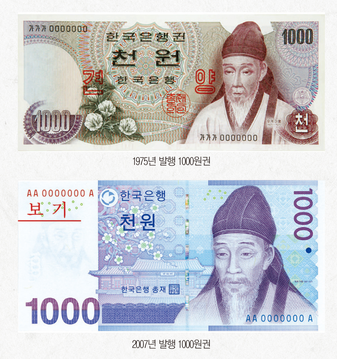 1975년 8월 발행된 1000원권의 인물은 조선중기 문신이며 성리학의 대가로 영남학파를 형성한 퇴계 이황(李滉 1501~1570)이다.