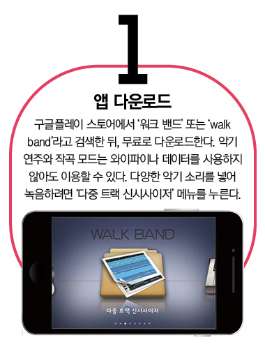 취미로 악기를 배우고 어느 정도 손에 익으면 창작곡을 연주해보고 싶다는 생각이 든다. 작곡할 땐 한 가지 악기가 아닌 피아노, 드럼, 베이스 등 다양한 소리를 맞춰봐야 한다. 여러 악기를 연주해 손쉽게 곡을 만들 수 있는 앱 ‘워크 밴드’를 이용하면 누구나 아티스트가 될 수 있다.