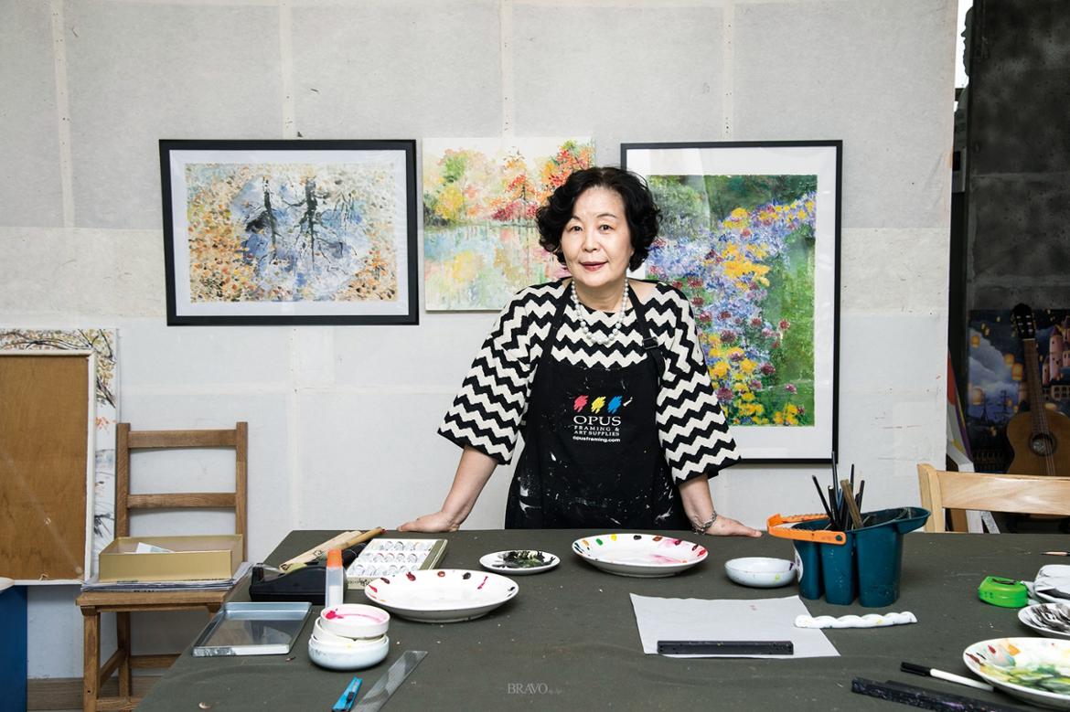 ▲화실에서 하효순씨의 모습. 뒤 쪽 그림이 그녀의 작품이다.