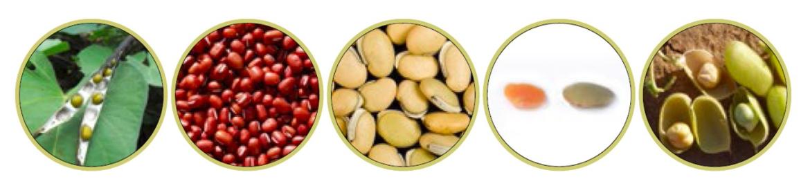 ▲왼쪽부터 녹두, 팥, 백편두, 렌틸콩, 병아리콩.