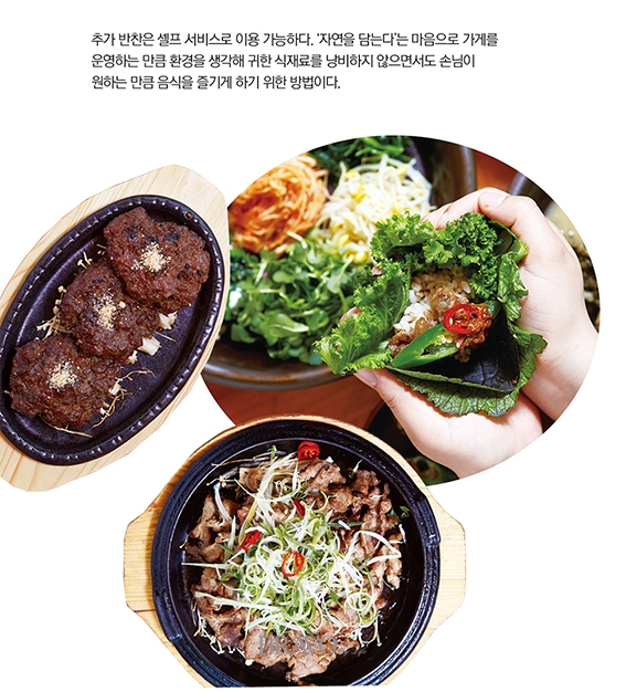 자연과 더불어 있는 만큼 유기농 쌈 채소 제공은 물론, 음식에 간을 할 때도 인공조미료나 첨가물을 넣지 않는다. 상추를 비롯해 케일, 로메인, 적겨자, 청겨자, 치커리, 적근대 등이 쌈용으로 나오는데 경기도 광주시 서하리의 자연농원에서 유기농으로 기른 채소라고 한다. 계절이나 상황에 따라 제공하는 쌈의 종류가 조금씩 바뀐다. 반찬은 제철 식재료를 활용하는데, 건강을 위해 저염으로 준비한다. 핵심 재료인 된장은 공산품이 아닌 해마다 직접 담근 것을 사용한다. 가게 뒤뜰에 가면 구수한 장을 숙성하는 장독들을 볼 수 있다.