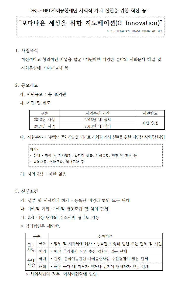 문화체육관광부 산하 비영리 재단법인인 GKL사회공헌재단에서 사회문제 해결을 위한 혁신적인 사업 아이디어를 발굴하고 지원하기 위해 사회공헌 사업 아이디어를 공모합니다.