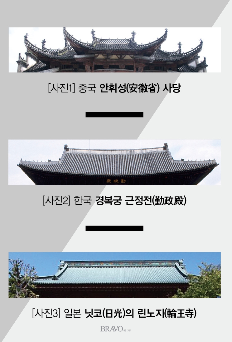 삼국의 전통 건물이 서양 건축에 비해 목조라는 점 외에 다른 공통점은 건축물에서 지붕이 차지하는 면적이 크다는 것이다. 그런데 흥미로운 사실은 한·중·일 삼국이 지붕 선(roof line)에서 큰 차이를 보인다는 것이다. 중국은 지붕 끝이 하늘을 향해 찌르듯이 올라가는 데[사진 1] 비해, 한국 지붕은 가운데 부위에서 지붕 양 끝이 조금 높아지는 느낌만 주는 정도[사진 2]이고, 일본의 지붕 선은 일직선으로 마무리되는 게 특징이다[사진 3]. 이런 차이점을 말하자, 그 동양 전문가는 무릎을 탁 치며 “그래, 정말 그러네” 하며 새로운 깨달음을 얻은 걸 기뻐하며, 왜 그 쉬운 차이를 여태껏 자기는 못 봤는지 모르겠다고 했다.