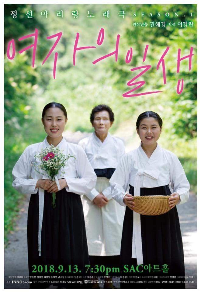 <여자의 일생>이라니. 당연하게도 기 드 모파상 소설 ‘여자의 일생’이 퍼뜩 떠올랐는데 2018년 현재 정선아리랑 극 제목으로 너무 고색창연한 거 아닌가. 심지어 하얀 한복에 검정치마 짚신 같은 고무신을 신고 있는 사진이 박혀 있어서 이거 아주 울고 짜고 신파로 흐르려나싶어 아주 조금 걱정도 됐다. 하긴 화장 짙게 하고 화려 찬란한 신식 무대의상 같은 한복을 입었더라도 이상했겠다싶었지만. 엄순분 할머니가 살아온 일생을 수십 개의 정선아라리 가사로 극화해 최진실과 신현영이 공연한다고 했다. 전문 공연은 아니더라도 정선아라리는 실컷 들을 수 있겠지 싶어 정선으로 여행가는 대신 공연장으로 달려갔는데.