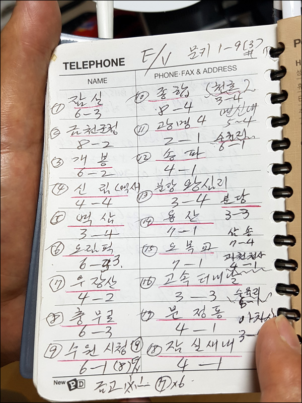 그러나 여유롭다는 것이 허술하다는 것을 의미하지 않는다. 일에 관한 한 어르신은 치밀하고 열정적이다. 일례로 어르신의 수첩에는 지하철역별로 가장 가까운 탑승 위치를 적은 메모가 깨알 같이 적혀 있다. 천리마택배에서 지하철의 엘리베이터 위치를 파악하는 것은 가장 큰 요령에 속한다. 엘리베이터에 가까운 차량에 탑승해야 물품 운반이 편리하고 신속한 배달이 가능하기 때문이다. 주요 거래처에 대한 세부 정보도 기록되어 있다. 어르신의 장점은 그런 자료를 혼자만 간직하는 것이 아니라 표로 만들어 게시판에 붙여 동료들과 공유를 한다는데 있다. 입사한 지 얼마 안된 경험이 적은 신입동료들에겐 매우 요긴한 정보가 아닐 수 없다.