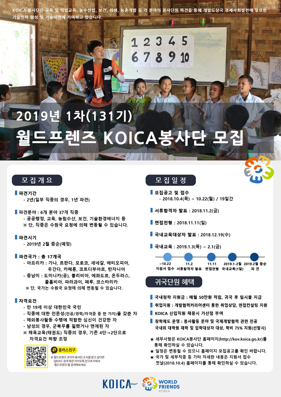 한국국제협력단(KOICA)은 10월 22일(월)까지 2019년 1차 월드프렌즈 코이카봉사단을 모집합니다.