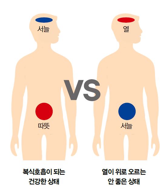 도시생활을 하면 머리만 쓰고 몸을 쓰지 않기 때문에, 머리는 뜨겁고 배는 차가운 상열하한증(上熱下寒證)이 생기기 쉽다. 머리가 뜨거워져서 열이 나면 잠을 제대로 못 자고 눈도 충혈되고 건조해지며 어깨와 뒷목은 자주 뭉친다. 반면 아랫배가 차가우면 소화가 안 돼 아랫배가 나오고 전립선이 붓고 정력이 떨어지며 다리와 무릎 힘이 약해지고 손발이 시리며, 여자는 자궁 기능이 나빠진다. 그리고 발바닥을 지압하면 몹시 아프다. 머리와 가슴에 열이 몰리면 화병의 상태와 유사하다. 당연히 컨디션이 좋을 리 없어 학생들의 경우는 학습 효과가 떨어진다. 등산을 하면 자연스럽게 복식호흡을 하게 된다. 이때 인체 상부에 몰린 열은 복식호흡을 통해 아랫배까지 내려가 손발 끝까지 퍼져나간다. 그래서 등산을 하면 잠도 잘 오고 어깨 뭉침도 잘 풀리고 머리와 눈이 맑아지고 밥맛이 나며 정력이 강해지고 다리 힘이 강해지는 것이다. 손발 시림도 많이 완화된다. 머리와 가슴의 열이 내려가므로 화병과 스트레스도 개선된다.