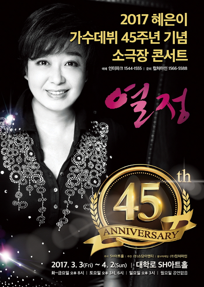 가수 혜은이가 데뷔 45주년을 맞아 열정’이라는 이름으로 콘서트를 연다. 팬들과 더 가까이에서 호흡하기 위해 대학로 소극장에서 한 달간 공연을 이어간다. ‘당신은 모르실 거야’, ‘제3 한강교’, ‘열정’ 등을 마음껏 들어볼 기회다.