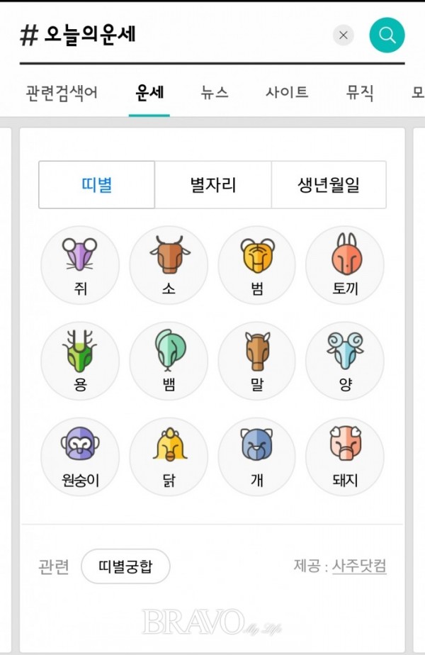검색창에 ‘#오늘의 운세’(띄어쓰기하지 않아도 가능)를 치면 띠, 별자리, 생년월일로 알아보는 일일 운세가 나온다. 맨 아래 카카오톡 아이콘을 눌러 공유할 수 있다.