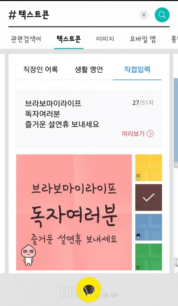 ‘#텍스트콘’을 활용하면 원하는 배경에 글자를 넣어 만든 카드 형태의 이미지를  공유할 수 있다. 생활 명언이나 어록 공유 기능도 있어 유용하다.