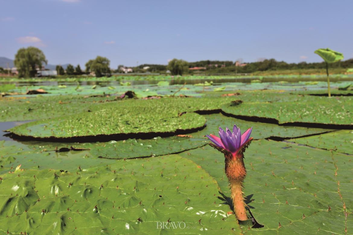 여름이면 만나곤 하는 성난 물의 모습은 여름이 곧 불과 물이 정면으로 맞서는 계절임을 일깨워줍니다. 그런 7~8월 불과 물이 상극(相剋)하는 틈새에서 피는 각별한 꽃이 있습니다. 태양의 열기를 온몸으로 받아 식히려는 듯 그늘 한 점 없는 연못, 흐르지 않는 저수지에 커다란 이파리를 잔뜩 깔고 보랏빛 영롱한 꽃을 피우는 물풀이 있습니다. 바로 100년 만에 꽃을 피운다는 가시 연꽃입니다.
