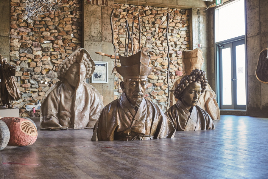▲오죽헌에 있는 신사임당과 율곡 이이 조형물은 최옥영 대표가 만든 작품이다. 오죽헌에 다녀온 관람객에게 한 번 더 이곳이 강릉이라는 것을 알리고 보이기 위해 설치해놓았다