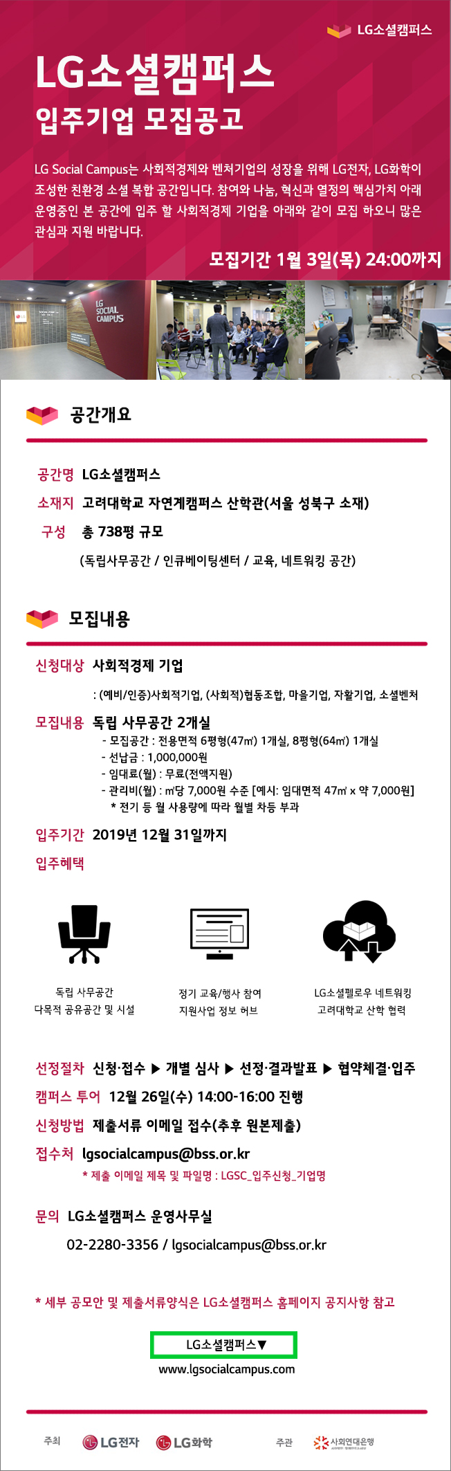 사회적기업과 벤처기업 지원을 위해 LG전자와 LG화학이 조성한 복합 공간 LG소셜캠퍼스에서 2019년 1월 3일(목) 24시까지 입주 기업을 모집합니다.