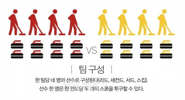 엄청난 두뇌싸움이 벌어지는 컬링은 리드(Lead), 세컨드(Second), 서드(Third), 스킵(Skip) 총 네 명의 선수가 한 팀을 이룬다. 각 선수에게 두 개의 스톤이 주어지며 연이은 순서로 상대 선수와 번갈아 투구한다. 양 팀 총 16개의 스톤이 모두 투구되면 한 엔드가 끝나게 되고 각 엔드가 끝날 때마다 점수를 계산한다. 총 10엔드로 진행되는 컬링은 팀당 73분이 주어지며 경기시간은 약 2시간 40분 정도가 소요된다. 만약 73분을 초과할 경우 패하게 된다. 한 팀에서의 역할은 총 3개로 나눌 수 있다. 스톤을 투구하는 투구자, 얼음 바닥을 문지르는 스위퍼, 주장으로서 작전과 스톤의 방향, 속도를 지시하는 스킵이다.