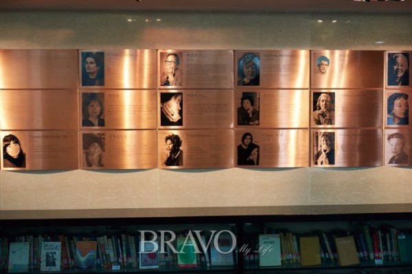 선정위원회가 고심 끝에 선정한 23인의 세계 여성 문인의 사진과 명문구로 꾸민 것이다. 최명희, 박완서, 박경리 그리고 제인 오스틴 등 여성 문학을 대표하는 문인들의 흔적을 감상할 수 있다. 동판 아래에는 한국 문학 초판본이 연도별로 구분, 전시되어 있고 바로 맞은편엔 외국 서적 초판본이 나란히 진열되어 있다. 이곳에서 1층을 내려다보면 특별한 장면이 눈에 들어온다. 바로 서가 위로 쓰인 문학 작품의 글귀들이다. ‘주요 문인 기증코너’에선 <여덟개의 모자로 남은 당신>의 소재가 된 남편의 모자, 즐겨 쓰던 서예도구, 찻잔 등 김남조, 박완서, 한무숙의 작품에 드러난 소재들과 작가들이 평소 아꼈던 애장품을 볼 수 있다.