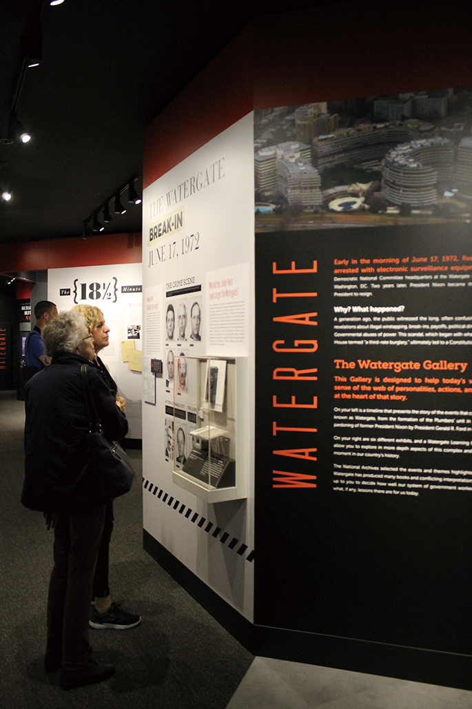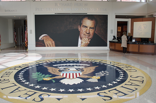 1960년 기세를 몰아 대통령에 출마하지만 젊고 파워풀한 이미지의 존 F. 케네디에게 패배하고 만다. 그 유명한 TV 생방송 토론이 바로 이때의 이야기다. 하지만 8년 후, 닉슨은 결국 미국 37대 대통령에 당선된다. 이때부터 닉슨은 어쩌면 미국의 가장 위대한 대통령으로 기록되었을 만한 많은 업적을 만들어낸다. 닉슨독트린 발표로 베트남전을 끝내고 중국과의 수교로 냉전시대를 종식시킨 평화 대통령. 그는 세계사를 다시 만든 인물이었다. 적어도 ‘워터게이트’ 사건이 터지기 전까지는. 닉슨의 업적을 고스란히 담고 있는 기념관을 지나면 마지막 ‘워터게이트’ 전시관에 닿게 된다. 전시 내용은 이곳이 닉슨기념관이라는 사실이 민망할 정도로 노골적이다. 이전까지 닉슨의 업적과 미국의 위대함에 감동하던 관람객들은 하나같이 얼굴이 굳어진다. 닉슨의 수치이자 미국의 민낯이기 때문이다. ‘워터게이트’는 미국 역사상 최대의 정치 스캔들이다. 1972년, 워싱턴 D.C.의 ‘워터게이트’ 건물에 입주한 민주당 전국위원회 본부에 도청장치를 설치하려던 침입자들이 체포된다. 이들은 공화당 비밀조직 멤버들. 당시 재선 선거운동 중이던 닉슨은 자신의 관련 여부를 단호히 부인했고 그해 압도적인 표 차이로 재선에 성공, 38대 대통령에 취임한다. 하지만 그의 부정 행위는 결국 서서히 드러난다. 닉슨은 기자회견에서 “나는 사기꾼이 아니다”라며 기자들을 쏘아붙였지만 결국 그가 가담했다는 증거가 담긴 비밀 테이프의 존재가 세상에 알려진다. 국회청문회가 열렸고 끝까지 아니라고 잡아떼던 닉슨은 결국 18분 30초가 사라진, 편집된 녹음 테이프를 내놓았다. 거짓말을 일삼고 국민과 국회를 기만한 대통령은 신임을 잃었다. 국회에서 탄핵소추안이 통과되고 탄핵이 확실시되자 1974년, 닉슨은 스스로 사임한다. 장장 2년에 걸친 싸움이었다. 전시관은 이 모든 것을 그대로 보여주고 있다. 심지어 헬기에 올라 백악관을 떠나던 닉슨 부부의 모습이 비디오로 무한 리플레이되고 있다. 닉슨의 생가 뒤편에는 닉슨과 그의 아내 패트 여사의 묘지가 있다.