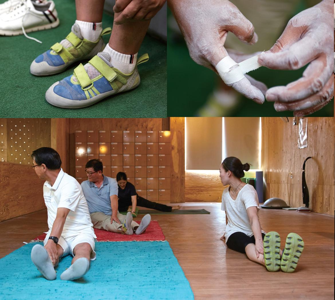 대부분의 사람이 운동하기 전 준비운동을 간과하는 경우가 있다. 특히 평소에 운동을 하지 않는 시니어가 무리할 경우 근육이 손상될 수도 있을 뿐만 아니라 예기치 못한 부상을 당할 수 있다. 따라서 운동 시작 전에는 항상 몸을 풀어주는 습관을 들이는 것이 좋다. 스포츠클라이밍은 손과 발로 벽에 부착된 홀드를 이용해 올라가는 근력운동이기 때문에 시작 전 충분한 스트레칭이 필요하다. 송율나 V10클라이밍 강사는 “스포츠클라이밍은 전신운동인 동시에 많은 근력이 필요하다”며 “특히 볼더링은 뛰어내리는 동작이 많기 때문에 무릎에 신경을 많이 써야 한다”고 조언한다. 부상을 예방하기 위해 스포츠 테이프를 사용해도 좋다. 스포츠 테이프는 굳은살을 방지하고 손가락을 보호해준다.