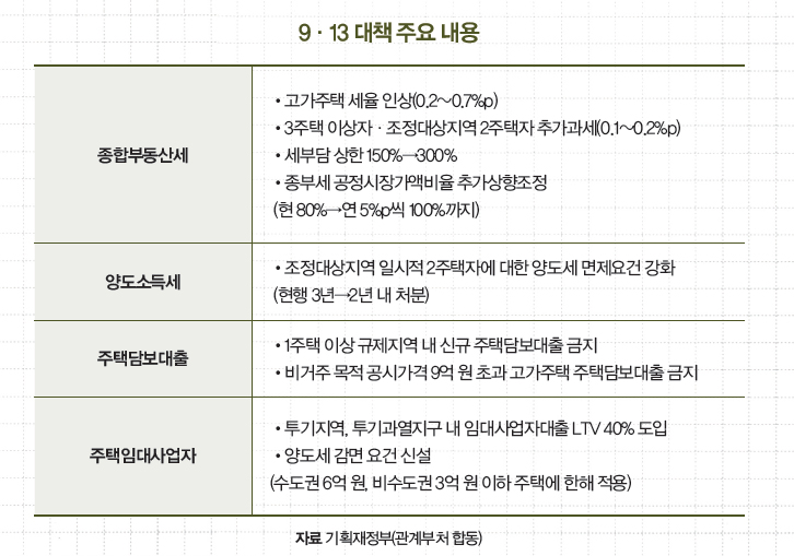 9·13 대책에 따르면 종부세 과표 3억~6억 원 구간이 신설되고, 세율은 구간별로 0.2~0.7%포인트 올라간다. 0.1∼0.5% 인상을 제시했던 정부안보다 강화했다. 과표 3억 원 초과구간에 대한 세율을 지금보다 0.2∼0.7%포인트씩 추가로 올려 최고세율을 2.7%까지 인상한다. 구간별로 과표 6억 원 초과구간에 대한 세율은 현행보다 0.1∼0.5% 인상하기로 했던 정부안보다 강화했다. 여기에 조정대상지역 내에서는 2주택 이상도 3주택 이상 다주택자와 마찬가지로 중과된다.