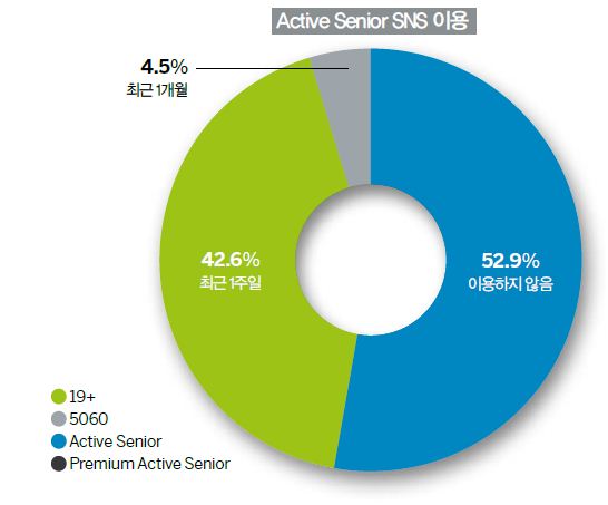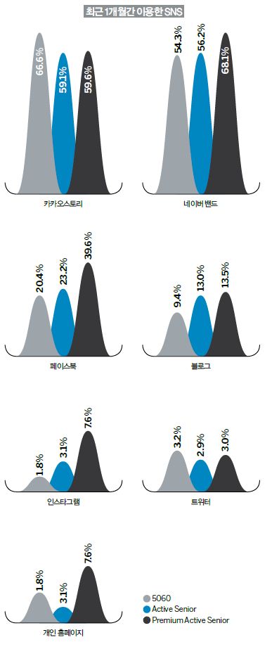 다른 미디어도 마찬가지다. 영화 역시 프리미엄 액티브 시니어는 84.8%가 최근 1년간 극장을 이용한 경험이 있는 반면, 50~60대는 56.2%에 그쳤다. 라디오 청취에 대해 프리미엄 액티브 시니어는 49.7%가 응답해 27.4%가 응답한 성인 평균과 차이를 보였다. 인터넷 활용도 프리미엄 액티브 시니어가 높았다. 50~60대는 64.0%에 그쳤지만, 프리미엄 액티브 시니어는 88.0%에 달했다. 이 부분은 다른 조사에서도 반영이 됐는데, ‘인터넷은 내 삶의 중요한 일부분’이라고 답한 프리미엄 액티브 시니어는 43.9%로 역시 50~60대 평균(23.2%)에 비해 두 배 가까이 높은 수치를 나타냈다. 인터넷과 따로떼어 말할 수 없는 SNS(사회관계망서비스)의 활용도 마찬가지. 이들의 SNS 활용은 48.7%로 절반 정도는 SNS를 통해 사람들과 소통하고 있었다. 이에 반해 일반 50~60대는 23.2%만이 활용하고 있다고 답했다. 그렇다면 어떤 SNS의 활용도가 높을까? 조사결과 프리미엄 액티브 시니어가 가장 좋아하는 SNS로 네이버 밴드(68.1%)가 꼽혔다. 카카오스토리(59.6%), 페이스북(36.9%), 블로그(13.5%), 인스타그램(7.6%)은 그 뒤를 이었다. 네이버 밴드를 가장 좋아하는 이유는 네이버 밴드의 기반인 폐쇄적 동호회 활동을 선호하기 때문인 것으로 보인다. 즉 내가 아는 지인들로 한정지어 일상을 공유하는 것을 더 편안해한다고 해석할 수 있다. 또 젊은층이 선호하는 페이스북이나 인스타그램의 활용도 눈에 띈다. 이는 해외 기반의 SNS에 거부감이 없고, 인적 관계를 국내에 한정짓지 않는다고 해석할 수 있다. 50~60대의 페이스북 이용률은 20.4%, 인스타그램의 이용률은 1.8%에 불과했다.