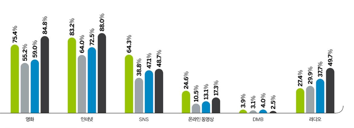이번 전체 조사에서 고소득 시니어층인 프리미엄 액티브 시니어가 대조군과 가장 많은 차이를 보이는 부분은 미디어를 대하는 태도에서 나타났다. 즉 정보를 어떤 태도로 대하며, 어떤 방식으로 접하고 또 그 정보를 어떻게 활용하는지에 관한 조사였다. 만약 성공에 관한 교과서로 불리는 스티븐 코비의 <성공하는 사람들의 7가지 습관>이 국내에서 다시 쓰인다면 이 부분을 참고해야 하지 않을까. 쉽게예상할 수 있듯 프리미엄 액티브 시니어는 모든 미디어를 접하는 데 적극적이었다. 일간지는 말할 것도 없고 주간지, IPTV, 인터넷 등 모든 분야에서 이용률이 높았다. 심지어 라디오 청취도 적극적이었다.