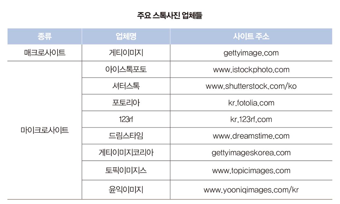 어떤 종류의 사진을 어떻게 찍어야 할지 고민이 된다면 대표적인 스톡사진 사이트를 둘러보라. 인쇄물의 배경으로 많이 쓰이는 잔디 사진 같은 자연을 소재로 한 사진에서부터 명함을 들고 있는 비즈니스맨, 청진기를 들고 있는 의사 같은 인물사진, 특정 장소와 위치를 보여주는 사진 등 그 종류는 무척 다양하다.