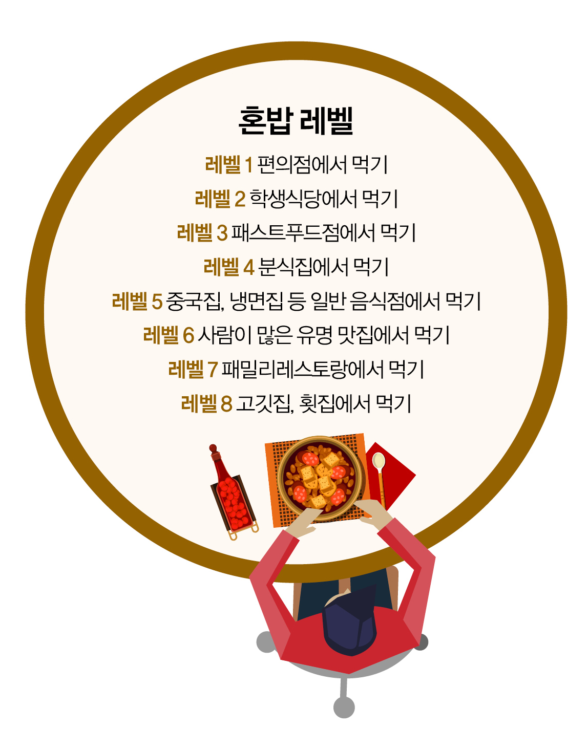1단계 편의점에서 밥 먹기,2단계 학생식당에서 밥 먹기, 8단계 고깃집, 횟집에서 먹기 등 단계가 올라갈수록 난이도가 올라가며 혼밥의 경지를 보여준다.