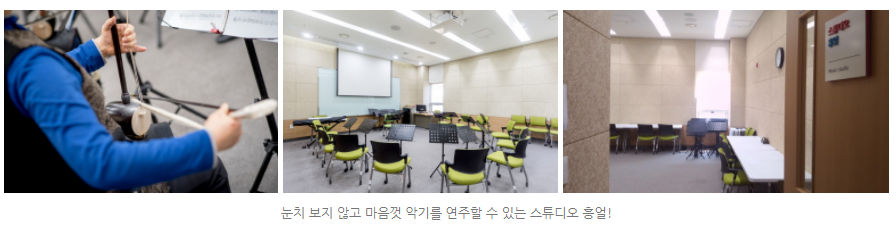 이름에서 알 수 있듯 음악 감상이나 악기 연주가 가능한 음악실이다. 벽체가 흡음 소재여서 노래연습이나 신나게 악기를 연주하고 싶다면