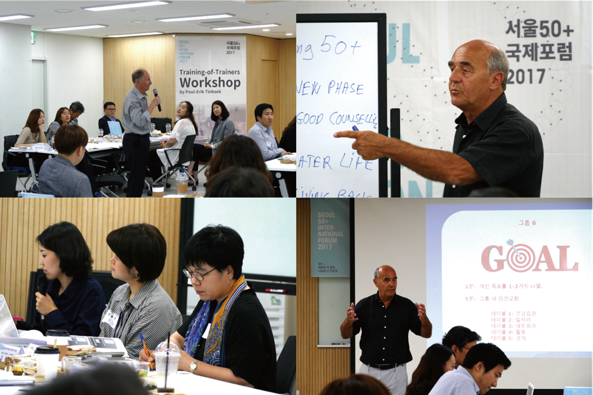 폴에릭 틴벡이 덴마크에서 워크숍을 진행해 본 경험을 50+ 종사자들에게 전수했다. 워크숍 장소에 마련된 10여 개의 테이블에는 50+재단과 캠퍼스, 센터 관계자, 인생학교 관계자는 물론 외부에서 50+당사자 교육을 고민 하며 연구하는 사람들이 4~5명씩 둘러앉았다.