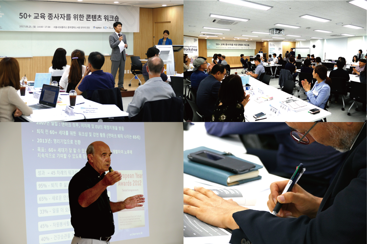 국제포럼 본 행사에 앞서 9월 25일에는 ‘50+교육종사자를 위한 콘텐츠 워크숍’이 서울시50플러스 중부캠퍼스 4층 모두의 강당에서 열렸다. 은퇴라는 인생의 가장 어려운 변화 시기를 앞두고 퇴직준비를 위한 워크숍을 통해 노후생활의 활력과 삶의 목적을 찾기 위한 디딤돌을 마련하는 시간으로, 본 포럼에서 다루지 못하는 현장감 있고 실질적인 내용들을 오고갔다.