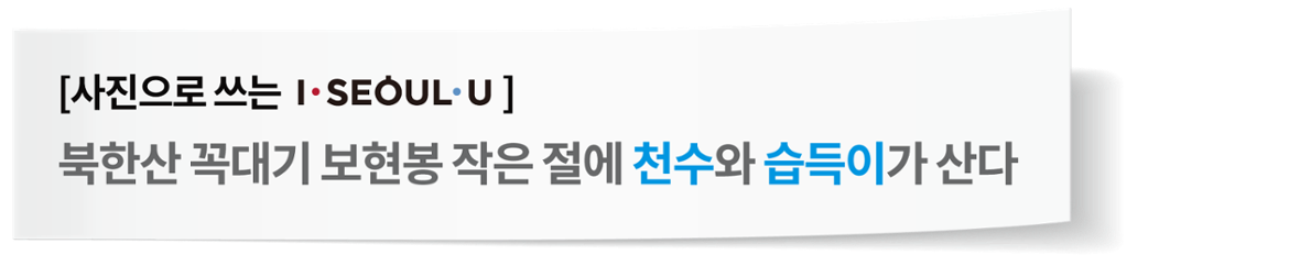 계곡을 따라 물을 적시며 걷다보면 대동문 못 미쳐 왼쪽으로 작은 절, 일선사가 있다. 스님은 한 분. 거기에 사는 개는 두 마리. 어느 날 숲 속에 들어온 개 한 마리를 들여 천수를 누리라고 천수라 이름지어준 장적스님이 계신다. 천수를 따라다니는 작은 개의 이름은 습득이. 엄마 따라 스님 따라 백만 가지 큰 도를 가만히 '습득'한다는 개다. 신이 아니면 옮길 수 없는 커다란 바위 아래 넓은 자리. 종종 스님과 절을 찾은 이들이 서울을 내려다보며 명상 아닌 명상을 하는 그곳에 오르려면 천수와 습득이가 먼저 오른다. 천진과 순수는 이런 것이라는 듯 오르자마자 두 마리의 개는 소리 없이 신나서 놀기 시작한다.