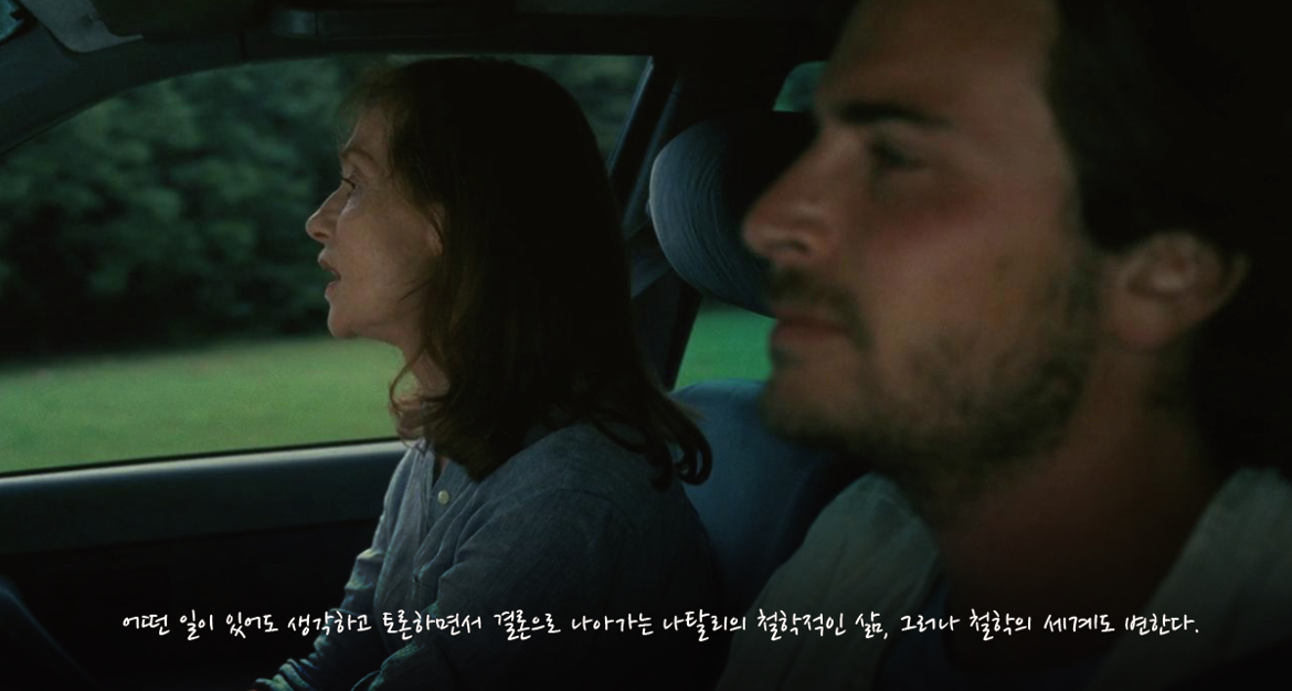오프닝 시퀀스, 즉 제목이 떠오르기 전, 짧은 이 장면 안에 이미 영화 주인공의 ‘지금껏 잘 살아왔고’의 세월의 내용이 다 들어있다. 나탈리는 철학교사로서 자기 일에 자긍심이 있다. 학생들이 스스로 생각할 수 있도록 성심을 다해 가르치면서 최선을 다해 리포트를 읽는다. 아이 둘은 구김살 없이 종알종알 이야기하며 자기들 관심사를 좇는다. 남편이 좋아하는 음악 이야기를 같이 나눈다. ‘지금까지’을 잘 살고 있는 중이다. 그러나 사실 이 장면 안에 나탈리가 맺고 있는 인물관계도의 심리적 거리도 다 볼 수 있다. 먼저 나가서 서 있거나, 음악 이야기(25년 동안 슈만과 브람스만 들었다)만 하거나 공연히 혼자 남아 먼 바다를 바라보며 딴 생각에 잠긴 남편과 나탈리의 거리, 아직 묘비나 무덤, 죽음 같은 것에는 관심 없는 천진한 아이들과 엄마인 동시에 늙어가는 엄마를 둔 나탈리의 거리.